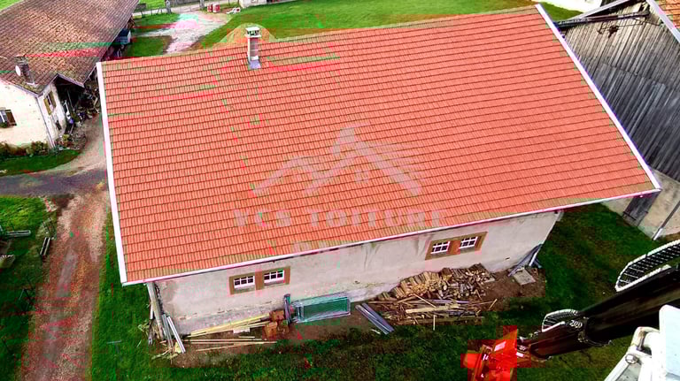 Toiture de bâtiment agricole en tuile mécanique.